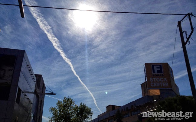 ανώνυμε 3:29 μ.μ…έχουν πει πως ψεκάζουν δήθεν για την προστασία μας απο τις υπεριώδεις ακτίνες του ήλιου. Οπότε ειναι ''καλυμμένοι'' ουσιαστικά και δεν τους νοιάζει αν φαίνεται. Το θέμα μας δεν είναι αυτό, αλλά το τι βλαβερό για τον οργανισμό μας περιέχει αυτό που ρίχνουν (το οποίο έχει μελετηθεί και ουσιαστικά είναι γνωστό).