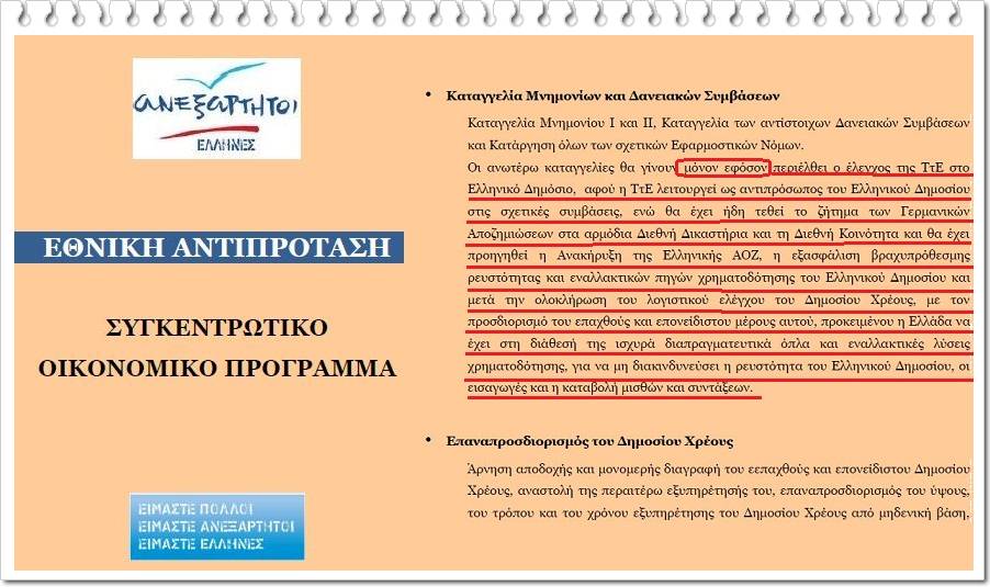 Για πρόγευση, σας δίνω ακριβώς, το κομμάτι του οικονομικού προγράμματος των Ανεξάρτητων Ελλήνων του κυρίου Π. Καμμένου που αναφέρεται στην… καταγγελία του Μνημονίου, το οποίο καταδικάζουν για να υφαρπάξουν την ψήφο σας!!!