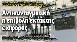 Μάλιστα, κάτι τέτοιο θα αποτελέσει πρόκριμα και για τις άλλες έκτακτες εισφορές, που επεβλήθησαν τα τελευταία 2,5 χρόνια, ανατρέποντας ουσιαστικά μεγάλο μέρος των μέτρων κατά της κρίσης που ήδη έχουν ληφθεί και λογιστεί για την, οπωσδήποτε, εντυπωσιακή μείωση του ελλείμματος!