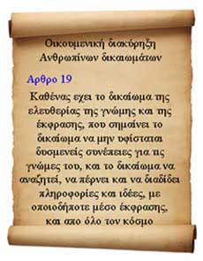 Καθένας έχει το δικαίωμα της ελευθερίας της γνώμης και της έκφρασης, που σημαίνει το δικαίωμα να μην υφίσταται δυσμενείς συνέπειες για τις γνώμες του, και το δικαίωμα να αναζητεί, να παίρνει και να διαδίδει πληροφορίες και ιδέες με οποιοδήποτε μέσο έκφρασης, και από όλο τον κόσμο.