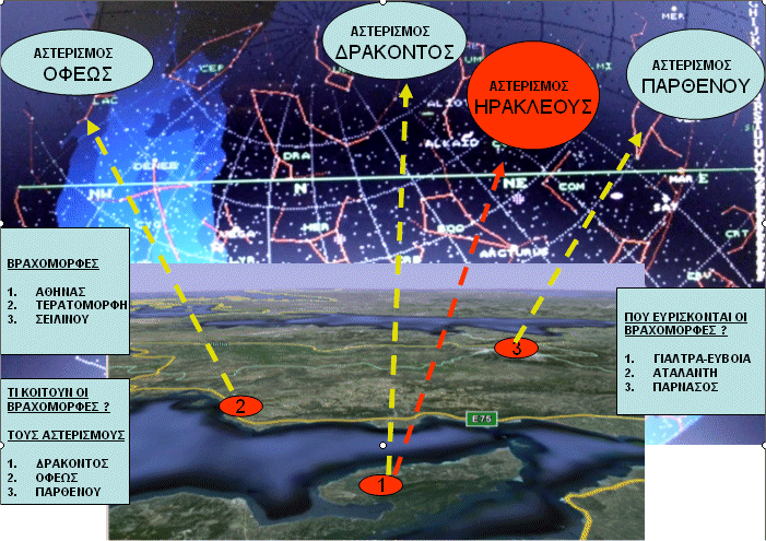 ιο μαντείο υπό την αιγίδα του μαντείου των Δελφών”. Ακόμα: “Τα ιερά των αγροτικών περιοχών πρέπει να βρίσκονται συμμετρικά κατανεμημένα, άλλα αφιερωμένα σε θεούς και άλλα σε ήρωες.” (“Πολιτικά”, VII 1331α).Ο Στράβων, πάλι, έγραψε ότι: “Όσοι ασχολούνται με τις θέσεις των διάφορων τόπων λαμβάνουν υπόψη τα δεδομένα των αστρονόμων και των γεωμετρών σχετικά με τα σχήματα, τα μεγέθη και τις αποστάσεις”, ενώ ο Παυσανίας παρέδωσε ότι: “Ο δήμος του Μαραθώνα απέχει ίση απόσταση από την Αθήνα με την απόσταση της Καρύστου, που βρίσκεται στην Εύβοια, από την Αθήνα”(“Αττικά” 32, 3), αναφορά που δεν αφήνει την παραμικρή αμφιβολία για το ότι όλοι αυτοί οι γεωμετρικοί συσχετισμοί ήταν επιμελώς προσχεδιασμένοι.