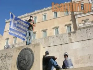 Λοιπόν… Στο βίντεο που θα δείτε, η λογική σηκώνει τα χέρια ψηλά και μπορούμε να αρχίσουμε να υποθέτουμε ό,τι θέλουμε. Στη διαδήλωση της Τετάρτης 19 Οκτωβρίου, ένας τύπος, ντυμένος με πολιτικά, που κρατούσε μια ελληνική σημαία γραμμένη με συνθήματα όπως «ΔΙΚΑΙΟΣΥΝΗ, ΨΩΜΙ» και… «ΟΙ ΠΟΛΙΤΙΚΟΙ ΝΑ ΜΑΣ ΠΡΟΣΕΓΓΙΖΟΥΝ» (sic) είχε σκαρφαλώσει πάνω στα σκαλοπάτια της Βουλής και ανάμεσα στα ΜΑΤ κράδαινε το… φλάμπουρο! Να σημειωθεί ότι …