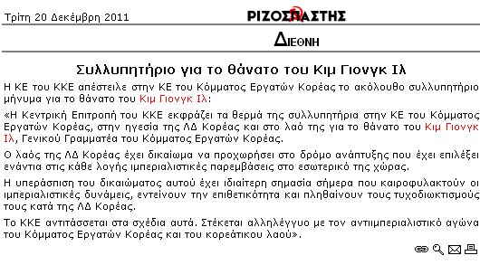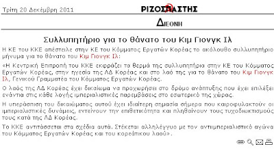 Ύστερα κάποιοι απορούν γιατί έπεσε τόσο κλάμα στην κηδεία του «λαοπρόβλητου και αγαπητού» ηγέτη Kim Jong-il. Όποιος δεν έκλαιγε σε Gulag κατευθείαν. Τέλος να σημειωθεί βέβαια ότι το ΚΚΕ έστειλε συλλυπητήριο τηλεγράφημα στο αδελφό κόμμα της Β. Κορέας και το λαό της –προφανώς αυτόν που βρίσκεται εκτός των Gulag – για το θάνατό του.http://redskywarning.blogspot.com/