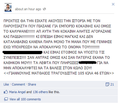 «Τις τελευταίες μέρες αντιμετώπιζα ατονίες λόγω υπερκόπωσης. Ενιωθα, λοιπόν, αδύναμος να ανταποκριθώ στις καλλιτεχνικές μου υποχρεώσεις. Δεν μπορούσα ούτε να φάω και μπήκα στον πειρασμό, μαζί με τον Βαζαίο, που και αυτός είναι περιστασιακός χρήστης, να παραγγείλουμε δύο δόσεις».