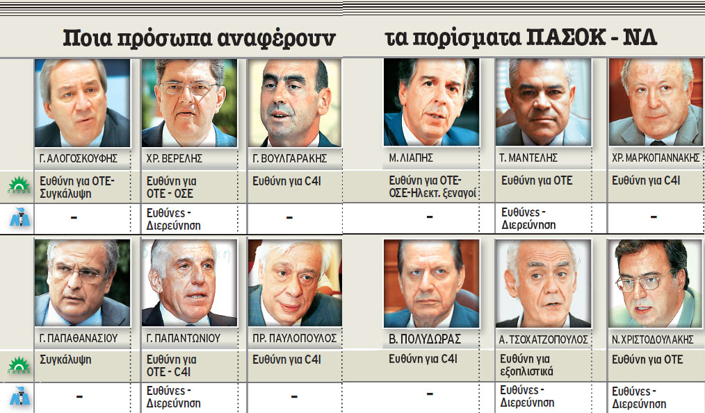 Τα δύο µεγάλα κόµµατα επέρριψαν, το κάθε ένα από την πλευρά του, τις ευθύνες σε 15 πολιτικά πρόσωπα. Κι όλα αυτά µε µια προσεκτική διατύπωση που δεν αποδίδει σε κανέναν τυχόν ποινική ευθύνη για περαιτέρω διερεύνηση, καθώς παραδέχθηκαν ότι δεν διαπιστώθηκε ροή µαύρου χρήµατος σε συγκεκριµένους πολιτικούς, παρά το γεγονός ότι µε την υπόθεση η Επιτροπή ασχολείται για περίπου έναν χρόνο και ανέβαλε τρεις φορές την έκδοση του τελικού της πορίσµατος προκειµένου να συγκεντρώσει επιπλέον στοιχεία.