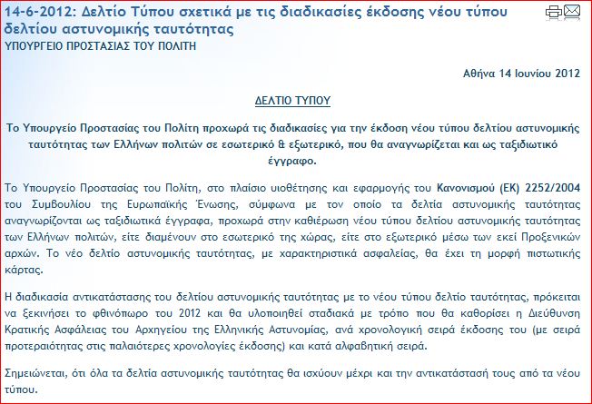 Δείτε το Δελτίο τύπου, του υπουργείου: 14-6-2012: Δελτίο Τύπου σχετικά με τις διαδικασίες έκδοσης νέου τύπου δελτίου αστυνομικής ταυτότητας, ΥΠΟΥΡΓΕΙΟ ΠΡΟΣΤΑΣΙΑΣ ΤΟΥ ΠΟΛΙΤΗ