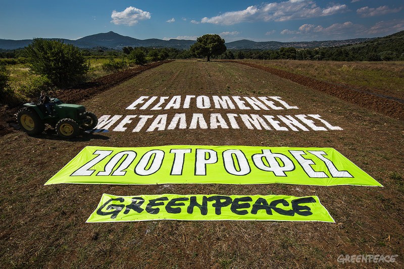 Οι ακτιβιστές της Greenpeace έγραψαν σε ακαλλιέργητο χωράφι το μήνυμα «Εισαγόμενες Μεταλλαγμένες Ζωοτροφές» και κατόπιν το όργωσαν, σβήνοντας έτσι με μία συμβολική κίνηση την εισαγόμενη, μεταλλαγμένη σόγια από τη διατροφή των ζώων!