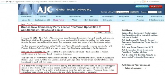 Η πανίσχυρη σιωνιστική οργάνωση (American Jewish Committee, AJC), που δήθεν ανησύχησε για την ένταξη του Βορίδη και του Άδωνη στην ΝΔ ( ΔΙΑΒΑΣΤΕ: ΚΑΛΛΙΣΘΕΝΗΣ  – VORIA.gr: “Κάθε κείμενο, έχει πολλαπλές αναγνώσεις…” ) απέστειλε απάντηση, στην οποία τονίζει ότι ο αρχηγός του κόμματος Αντώνης Σαμαράς επανέλαβε τη πλήρη αντίθεση του κόμματός του σε κάθε έκφραση αντισημιτισμού ή ρατσισμού. Μάλιστα στην επιστολή τους αναφέρεται ότι: