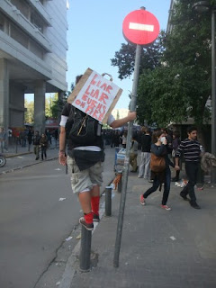 (Την φωτογραφία την τράβηξα το μεσημέρι της Πέμπτης 20 Οκτωβρίου στην οδό Μητροπόλεως, στο Σύνταγμα. Η κοπέλα με το πλακάτ είναι Γερμανίδα.)