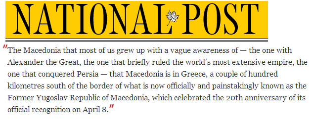 “Η Μακεδονία που οι περισσότεροι από εμάς μεγαλώσαμε με ασαφή πληροφόρηση, αυτή του Μεγάλου Αλεξάνδρου, του ανθρώπου που δημιούργησε μιά από τις μεγαλύτερες αυτοκρατορίες στον κόσμο, αυτή που κυρίεψε την Περσική αυτοκρατορία, αυτή η Μακεδονία είναι στην Ελλάδα, μερικά εκατοντάδες χιλιόμετρα νότια από τα σύνορα αυτής της χώρας που είναι τώρα επίσημα γνωστή ως FYROM και γιόρτασε την 20η επέτειο από την επίσημη της αναγνώριση στις 8 Απριλίου“, γράφει ο Καναδός αρθρογράφος.