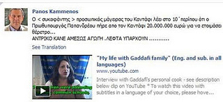 Συνεχίζει τα ποστ του στο Facebook κατά της οικογένειας Παπανδρέου ο Πάνος Καμμένος, ο οποίος δημοσίευσε βίντεο με μαρτυρία του μάγειρα του του Καντάφι που αποκαλύπτει ότι ο πρώην πρωθυπουργός της Ελλάδας (Γ. Παπανδρεου) πήρε από τον πρώην ηγέτη της Λιβύης 20.000.000 ευρώ για να χτίσει θέρετρο!