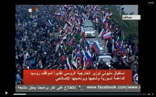 Λόγω της ψυχολογικής προετοιμασίας της κοινής γνώμης για την επερχόμενη Νατοϊκή επέμβαση, τα “ανεξάρτητα” ελληνικά Μ.Μ.Ε. μεταδίδουν μόνο σκηνές αιματοχυσίας από τη Συρία…Σήμερα λοιπόν, ο Ρώσος Υπ.Εξωτερικών Σεργκέι Λαβρόφ κατέφθασε στη Συρία μετά το Σινορωσικό βέτο, και στο βίντεο που μεταδίδει το Reuters γίνεται δεκτός με επευφημίες από το Συριακό λαό…