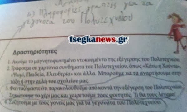 Την περασμένη εβδομάδα, οι μαθητές της τρίτης δημοτικού διδάσκονταν από τη δασκάλα τους για τα γεγονότα του Πολυτεχνείου και σαν εργασία για το σπίτι, τους είπε να απαντήσουν στα 4 ερωτήματα του βιβλίου που μπορείτε να διακρίνετε στην παρακάτω φωτογραφία.