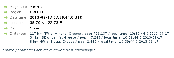 Οπως αναφέρει το Μεσογειακό Σεισμογραφικό Ινστιτούτο, η σεισμική δόνηση σημειώθηκε στις 10:39 της Τρίτης, μεγέθους 4,2 Ρίχτερ με εστιακό βάθος ενός χιλιομέτρου, 34 χιλιόμετρα νοτιοανατολικά της Λαμίας και 8 χιλιόμετρα βορειοδυτικά της Ελατιάς.