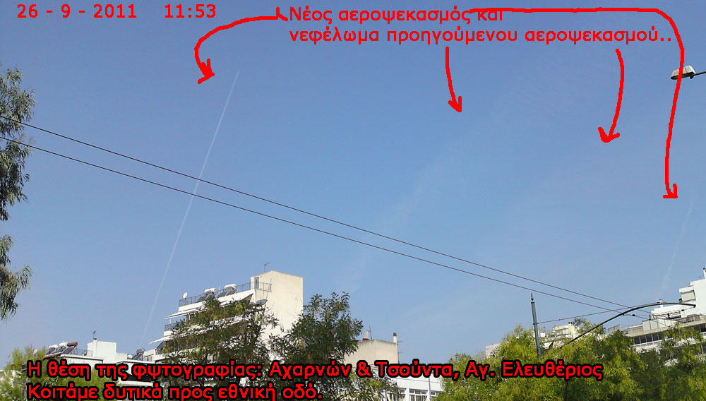 Βομβαρδισμός από χημικούς αεροψεκασμούς το πρωί μεταξύ 11:00 – 12:00. (Δεν παρακολουθήσαμε εάν έγιναν αεροψεκασμοί το απόγευμα, αλλά ήταν τόσοι πολλοί οι πρωινοί που έχουμε την εντύπωση πως δεν χρειαζόταν) Δείτε τα βίντεο που τραβήξαμε στο κανάλι μας στο youtube: