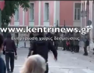 Προχωράει προς το μέρος τους κάνοντας νόημα στους υπόλοιπους «κουκουλοφόρους» να σταματήσουν να πετούν πέτρες ενώ παράλληλα ζητά από τους άνδρες των ΜΑΤ να υποχωρήσουν και να κατευθυνθούν προς την οδό Φιλελλήνων. Προφανώς οι κ.κ. Χρήστος Παπουτσής, Μανόλης Όθωνας και Λευτέρης Οικονόμου (υπουργός, υφυπουργός