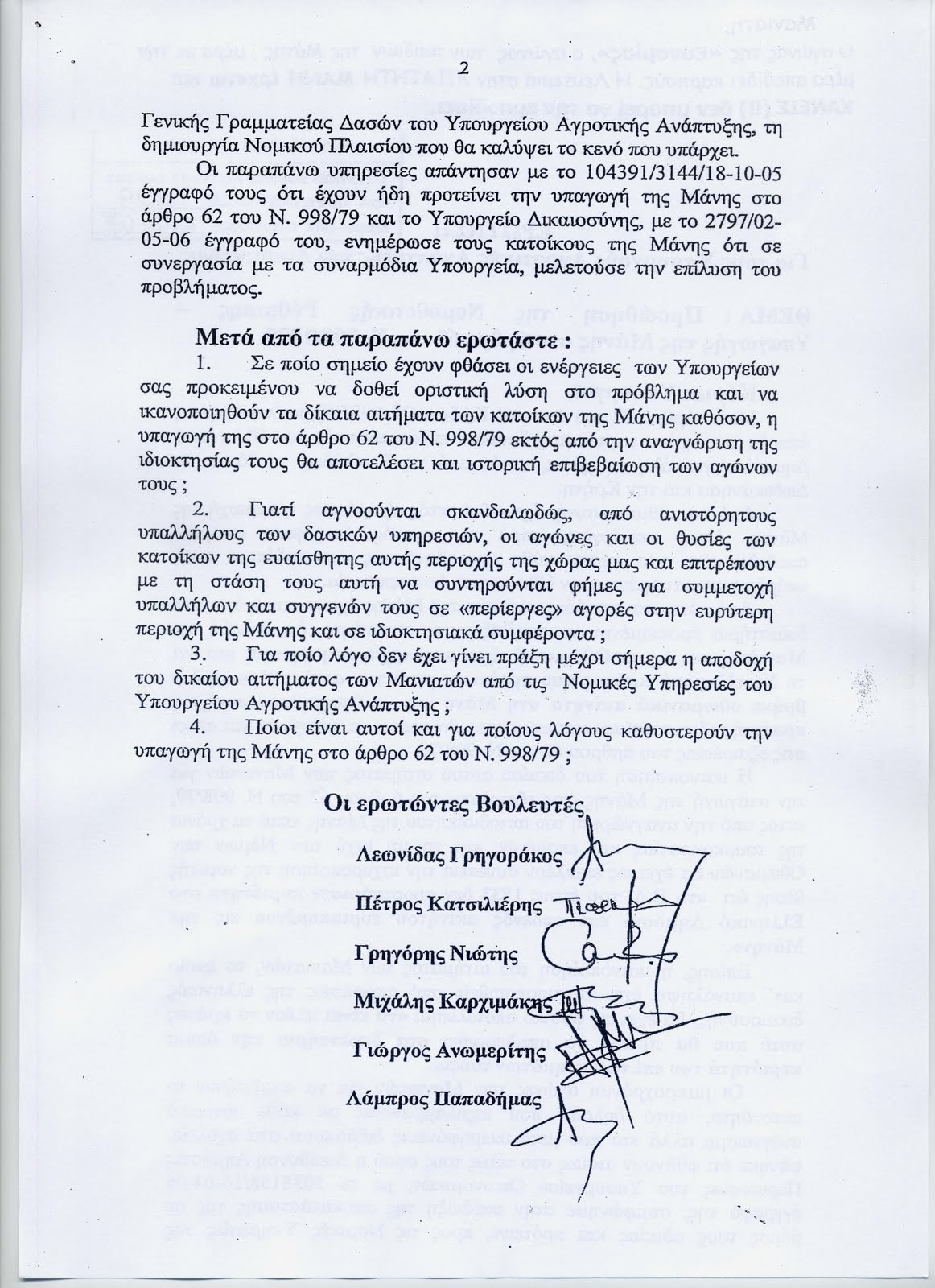 Πέρασαν ΗΔΗ  επτά χρόνια!  και το θέμα της επίλυσης του προβλήματος της Μάνης με την υπαγωγή της στο άρθρο 62 του Ν.998/79 εξακολουθεί να παραμένει στα δίχτυα της γραφειοκρατίας που αποτελεί και την βάση της διαφθοράς.