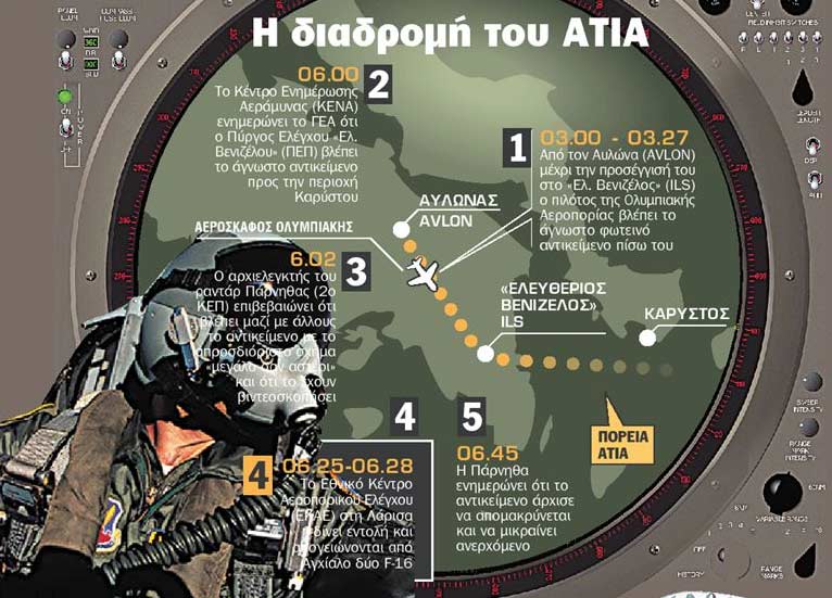 2007 – Φωτεινό αντικείμενο στον ουρανο της Αττικής. «Στενή επαφή» με άγνωστο φωτεινό αντικείμενο είχε πέρυσι, για ώρα, πάνω από την Αττική αεροσκάφος της Ολυμπιακής Αεροπορίας που εκτελούσε το νυχτερινό δρομολόγιο Λονδίνο- Αθήνα. Η αναφορά του πιλότου, που με έκπληξη είχε δει ότι από τον Αυλώνα μέχρι το αεροδρόμιο «Ελευθέριος Βενιζέλος» το άγνωστο αντικείμενο άλλαζε συνεχώς θέσεις αριστερά και δεξιά του, έθεσε σε συναγερμό το σύστημα αεράμυνας της χώρας, που απογείωσε δύο F-16 επιφυλακής για τον εντοπισμό του! Πολύ περισσότερο που την αναφορά του κυβερνήτη της Ολυμπιακής για περίεργο φωτεινό αντικείμενο επιβεβαίωσαν με όσα είδαν εν συνεχεία από το έδαφος τουλάχιστον 4-5 παρατηρητές και ελεγκτές της Πολιτικής και Πολεμικής Αεροπορίας. Ωστόσο, το «ασυνήθιστου σχήματος» αντικείμενο ούτε τα ραντάρ της Πολεμικής Αεροπορίας κατέγραψαν ούτε οι χειριστές των F-16 εντόπισαν, επιτείνοντας το μυστήριο.