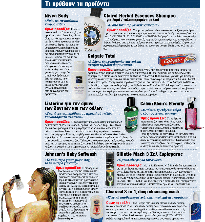 Η συγκεκριμένη έρευνα δημοσιεύτηκε στα Νέα το Σαββατοκύριακο, μεταξύ 12 και 13 του Φεβρουαρίου του 2005. Απο τότε δεν έγινε τίποτα για να σταματήσει αυτό το τρομερό σκάνδαλο. Μωρά αλείφονται απο τις ανυποψίαστες μαμάδες με τρυφερά αρωματικά φαινομενικά αγνά προϊόντα Άνθρωποι τυπικοί στην πρόληψη της υγείας τους φροντίζουν την στοματική υγιεινή τους, κορίτσια ακούνε τα περιοδικά life style και επιμένουν να φροντίζουν τα μαλλιά τους με “περιποιητικά” προϊόντα για λάμψη και υγεία! Η μεγάλη κοροϊδία βρίσκεται στο γεγονός ότι όχι μόνο αυτά τα προϊόντα εξακολουθούν και πωλούνται σε όλον τον πλανήτη, ότι όχι μόνο πλασάρονται ως δείκτες της κοινωνικής μας καταξίωσης, αλλά μας υπόσχονται και το κυριότερο αγαθό. Την υγεία. Και παίζουν μαζί της, σαν να ήμαστε ήρωες σε video game.