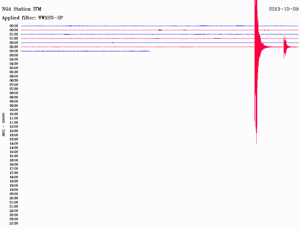 Ο σεισμός, όπως τον κατέγραψε ο σεισμογράφος του Σεισμολογικού Δικτύου του Γεωδυναμικού Ινστιτούτου του Εθνικού Αστεροσκοπείου Αθηνών, που είναι τοποθετημένος στην Ιθώμη του νομού Μεσσηνίας.