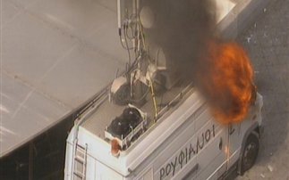 Άγνωστοι έβαλαν φωτιά και στο δεύτερο βαν κινητής τηλεφωνίας που βρισκόταν στο κέντρο, προκειμένου να ενισχύσει το σήμα και να βοηθήσει την επικοινωνία των χιλιάδων πολιτών που διαδηλώνουν για περισσότερο από ένα μήνα στο Σύνταγμα. Μάλιστα, έγραψαν με σπρέι πάνω σε αυτό τη λέξη «ρουφιάνοι», θεωρώντας ότι ήταν τηλεοπτικό συνεργείο.