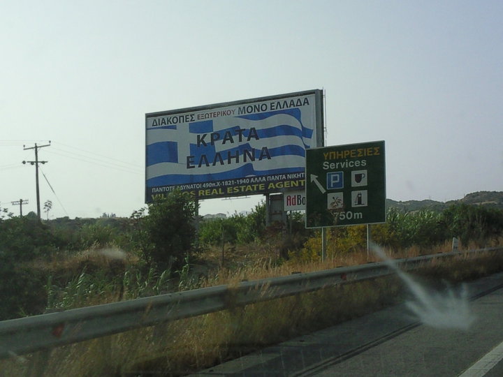Η αγωνία έκδηλη αποτυπώνεται σε γιγάντιες πινακίδες με παραστατικότατες εικόνες στην κεντρική οδική αρτηρία Λεμεσού-Λευκωσίας και δείχνει ανάγλυφα το ενδιαφέρον των Ελλήνων κατοίκων της Μεγαλονήσου για την οικονομική δοκιμασία της αιώνιας Ελλάδας μας.