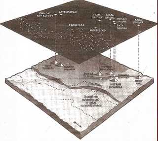 Οι εκπληκτικές και ακριβείς αντιστοιχίες του τμήματος του ουρανού στον αστερισμό του Ωρίωνα με την περιοχή των Πυραμίδων, στην Γκίζα της Αιγύπτου. Το γεγονός προκαλεί αίσθηση στον επιστημονικό κόσμο από τότε που έγινε γνωστό. Παρατηρήστε ότι όχι μόνο οι θέσεις των επτά πυραμίδων και κτισμάτων της περιοχής -μεταξύ των οποίωνκαι η Μεγάλη Πυραμίδα – αντιστοιχούν ακριβώς στους αστέρες του Πρίωνα, αλλά και ότι το σχήμα του ποταμούΝείλου αντιστοιχεί στο σχήμα του Γαλαξία στο συγκεκριμένο τμήμα του ουράνιου χάρτη!