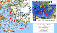 Ο χάρτης της φωτογραφίας έχει εκδοθεί απο τη National Geographic Society των HΠΑ, για το διεθνώς αναγνωρισμένο περιοδικό “Τhe National Geographic Magazine”. Παρατηρείστε τη διασυνοριακή γραμμή με κόκκινο διακεκομμένο χρώμα που υπάρχει στον χάρτη αυτόν, που ξεκινάει απο τον Εβρο και φτάνει μέχρι το Καστελόριζο. Αυτή η γραμμή είναι συμβατή με τις διεθνείς συνθήκες, που αφορούσαν την Ελλάδα και την Τουρκία ως το 1977 (παρατηρείστε, τα σημεία που δείχνουν τα κόκκινα βέλη – κάνετε κλίκ στη φωτογραφία).