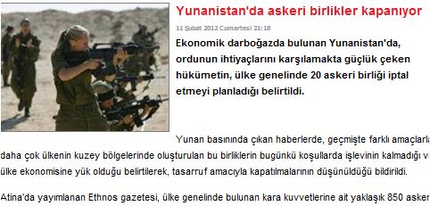 Με την οικονομική ύφεση η κυβέρνηση δυσκολεύεται να καλύψει τις ανάγκες του στρατού και δήλωσε ότι σχεδιάζει να κλείσει 20 στρατιωτικές μονάδες στη χώρα, γράφει το τουρκικό δημοσίευμα και συνεχίζει: Τα ελληνικά μέσα ενημέρωσης ανέφεραν ότι στο παρελθόν, αυτές οι μονάδες είχαν δημιουργηθεί για διαφορετικούς σκοπούς στις βόρειες περιοχές της χώρας και τώρα που η χώρα έχει ένα μεγάλο οικονομικό φορτίο δεν θεωρείται απαραίτητη η δραστηριότητά τους.