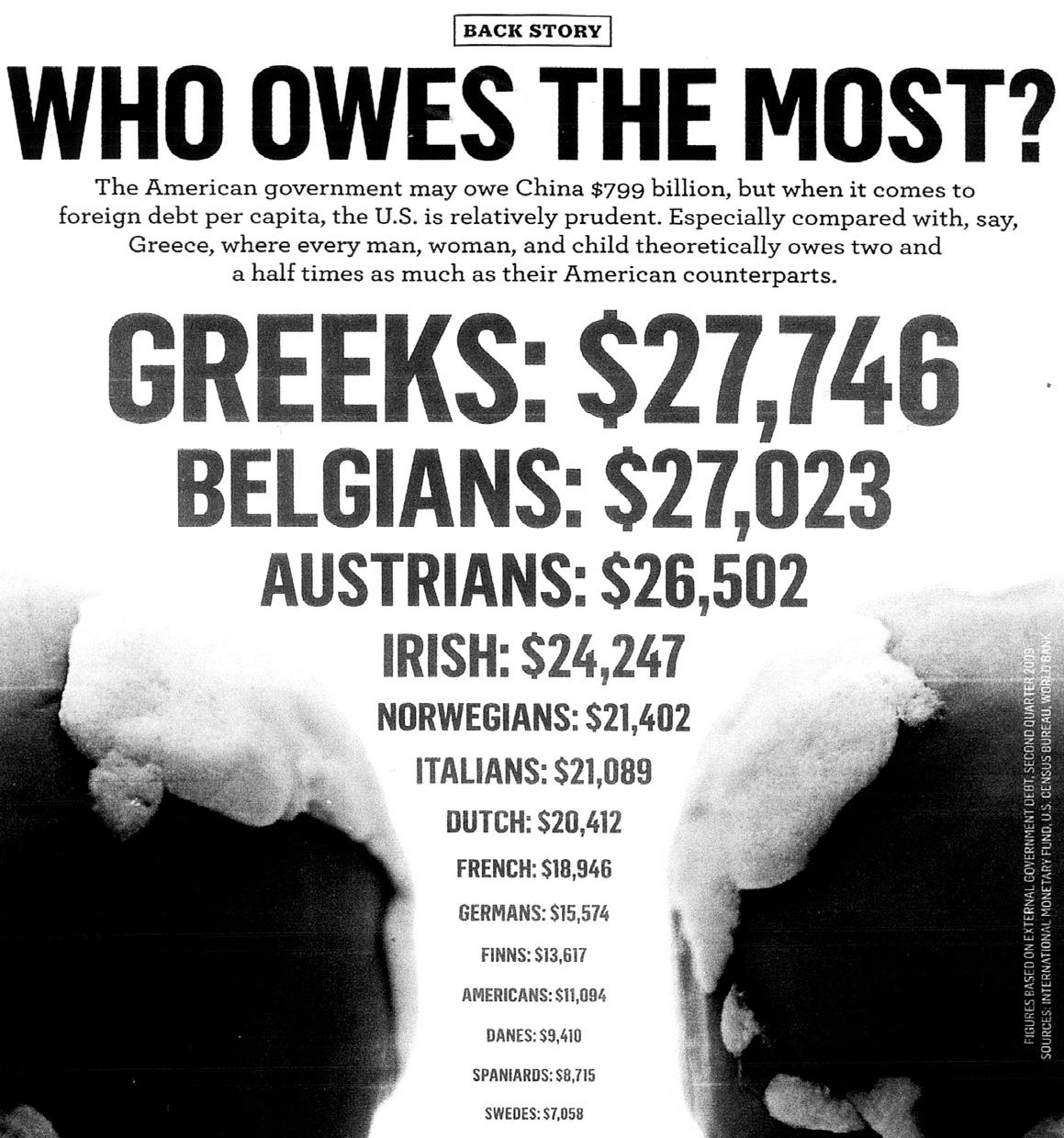 Αν κάνετε την πρόσθεση θα αντιληφθείτε ότι χρωστάμε περίπου 1 τρις ¤ τα οποία αν δεν κάνουμε κάτι σε λίγα χρόνια θα ξεπεράσουμε το 1,5τρις ,όταν το ΑΕΠ τώρα είναι στο 13%(δηλ. αν όλοι βάζαμε τα λεφτά μας πάνω σε ένα τραπέζι πλούσιοι και φτωχοί δεν θα συγκεντρώναμε ούτε 250δις)