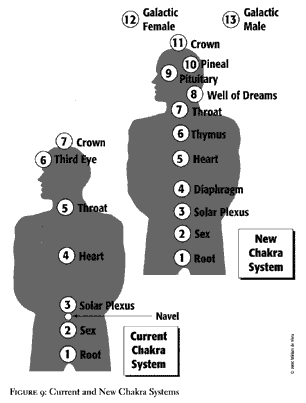 Αντί για τα προηγούμενα επτά κέντρα του φυσικού σώματος, το μεταμορφωμένο σώμα σας τώρα θα έχει έντεκα. Αυτό το δίκτυο των έντεκα κέντρων έχει δυο επιπλέον δια-διαστασιακά (αιθερικά) κέντρα τοποθετημένα πάνω από το κεφάλι. Ονομάζονται «Συμπαντικό Θηλυκό» και «Συμπαντικό Αρσενικό». Συνολικά θα έχετε δεκατρία πρωτεύοντα ή κύρια τσάκρας – δυο εντελώς αιθερικά και έντεκα, που θα είναι μέρος των φυσικών εαυτών σας (εικόνα 9). Ας ξεκινήσουμε το επόμενο τμήμα της σύντομης περιήγησής μας με την περιγραφή αυτών των νέων και επί του παρόντος μεταμορφούμενων τσάκρας.