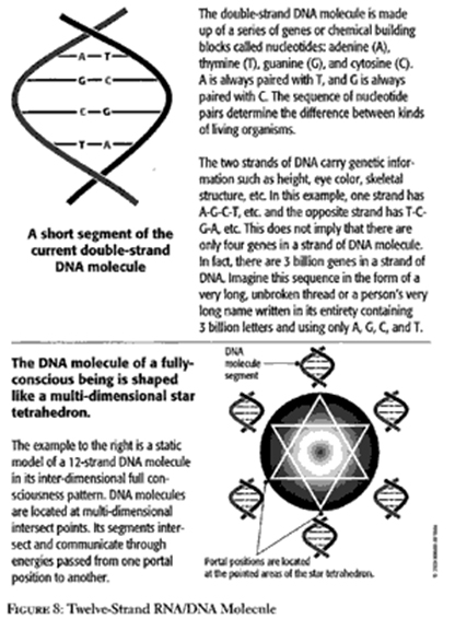 Η υλική βάση της πλήρους συνείδησής σας είναι το δωδεκαπλό RNA/ DNA. Αυτό το εκπληκτικό οργανικό ενεργειακό υλικό παίρνει το σχήμα ενός αστεροειδούς τετράεδρου (εικόνα 8), το οποίο περιστρέφεται σταθερά πάνω στα έξι κυριότερα σημεία του άξονά του. Επιπροσθέτως, ο τρίτος κλώνος σε κάθε μια από τις έξι έλικες συνδέεται (και συνεχώς υφαίνει ενεργειακά μοτίβα γύρω του) στον κεντρικό πυρήνα του αστεροειδούς τετράεδρου.