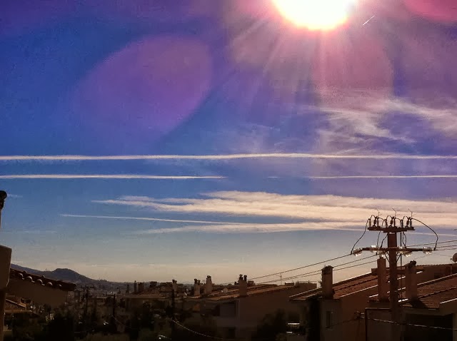 παντου γραμμες ασπρες κατα τις 5-6 το απογευμα και μετα οσο βραδυαζε οι γραμμες μαυριζαν,γινοντουσαν σαν καπνος μαυρος.ειχε σημερα και ουρανιο τοξο που οι εγχρωμες γραμμες του ηταν θολες.απο τοτε που ξεκινησε το μνημονιο στην κυπρο ριχνουν πολυ χημικο!!!
