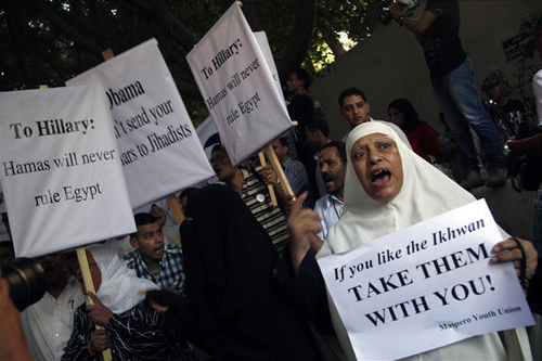 Δεν ήταν σαφές ποιοι ήταν οι διαδηλωτές ή τι πολιτικές πεποιθήσεις μπορεί να είχαν. Οι Διαδηλωτές έξω από το ξενοδοχείο της Κλίντον , το Σάββατο το βράδυ , φώναζαν αντι-ισλαμικά συνθήματα, κατηγορώντας τις Ηνωμένες Πολιτείες για την υποστήριξη τους στην άνοδο της Μουσουλμανικής Αδελφότητας στην εξουσία.