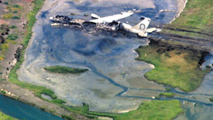 Ένα ακόμη αεροπορικό ατύχημα; Όχι ακριβώς! Οι φωτογραφίες που βλέπετε είναι τραβηγμένες την επόμενη ημέρα του ατυχήματος, Πέμπτη 19 Μαΐου, και απεικονίζουν το αεροπλάνο σε μία λίμνη που θυμίζει λιωμένο αλουμίνιο. Προσέξτε δεν κάηκε στα φτερά όπου είναι οι κινητήρες αλλά στην άτρακτο.