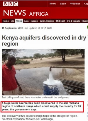 Εξαιρετική σύμπτωση, δεν βρίσκετε; Πριν από λίγες ημέρες, η Κένυα ανακοίνωσε την ανακάλυψη του μεγαλύτερου κοιτάσματος νερού στην Αφρική. Ικανό από μόνο του σύμφωνα με το BBC, να καλύψει τις ανάγκες ολόκληρης της χώρας, για τα επόμενα 70 χρόνια!