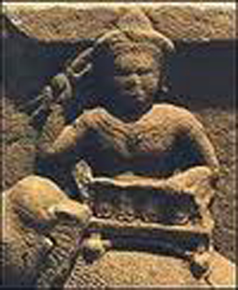 Ίντρα. Ένας βασικός θεός στην ινδουιστική μυθολογία, αντίστοιχος του Δία. Στο χέρι του κρατάει ένα Βάζτρα, δηλαδή ένα ЭIЄ.