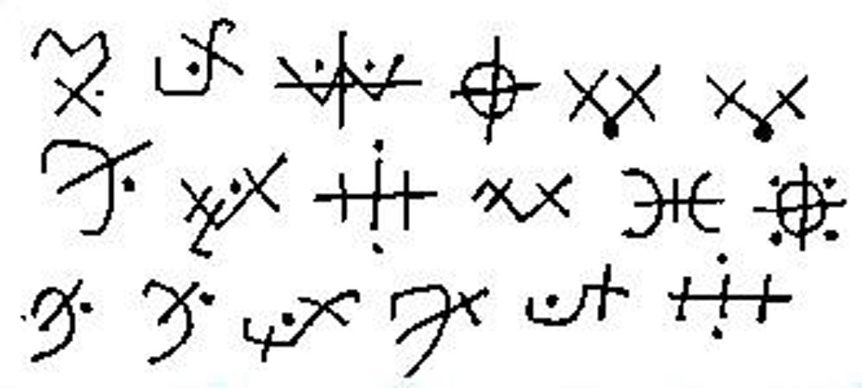 Δείγμα γραφής που θεωρείται εξωγήινη. Παρατηρήστε στην μεσαία σειρά, το δεύτερο γράμμα από δεξιά.