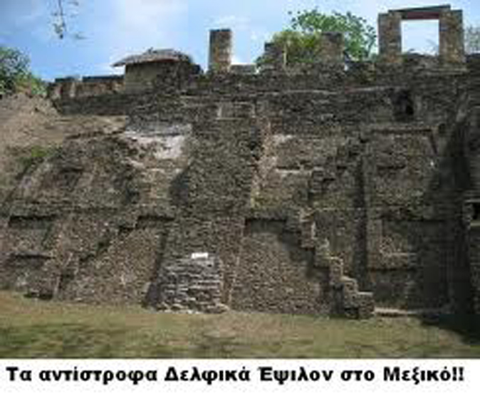 Τοιχοδομή αρχαίου κτιρίου στο Μεξικό, όπου τα ανεστραμμένα Ε παρουσιάζονται ταυτόχρονα και στην αρχαϊκή και στην σύγχρονη γραφή τους.