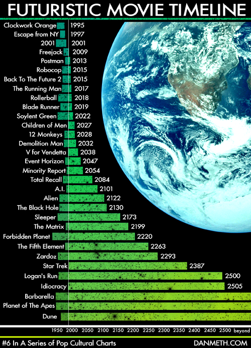 Πολλές από αυτές τις ταινίες είναι πράγματι «προφητικές». Χωρίς βέβαια την θεολογική έννοια του όρου, αλλά πραγματικά, λες και προ-βλέπουν το μέλλον. Είτε λόγω της γνώσης, της ικανότητας και της οξυδέρκειας του σεναριογράφου, είτε λόγω τύχης (;), είτε λόγω κάποιας εσωτερικής (μυστικής) πληροφόρησης, είτε λόγω ‘συνομωσίας’, πολλές τέτοιες ταινίες μπορούν και πιάνουν θέματα που από «φαντασία» γίνονται σύντομα σύγχρονη πραγματικότητα, (θυμάμαι τώρα το ‘The Island’ και το ‘Gattaca’ που παίζουν με τα θέματα της κλωνοποίησης και της γενετικής). Αποδεικνύονται έτσι, μετα-αποκαλυπτικές και πολλές φορές, σχεδόν, «επίκαιρες», μόνο που η επικαιρότητα είναι συνήθως εφιαλτική. Ιδού ένας κατάλογος τέτοιων ταινιών και το “προφητικό” χρονολόγιό τους:
