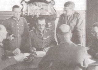 Η εικόνα της α’σελίδας είναι από την παράδοση της χώρας στα γερμανικά στρατεύματα από τον αντιστράτηγο Τσολάκογλου στις 21 Απριλίου 1941, δεύτερη ημέρα του Πάσχα. Όμως η ουσιαστική παράδοση είχε γίνει την προηγούμενη ημέρα, το Πάσχα της 20ης Απριλίου Κυριακή ήταν και τότε – με την πραξικοπηματική ανάληψη της διοίκησης της στρατιάς της Ηπείρου από τον Τσολάκογλου και την ενημέρωση του γερμανικού στρατήγείου, ότι “Παραδίδουμε τα όπλα και θέλουμε αύριο να υπογράψουμε συνθήκη ανακωχής”.