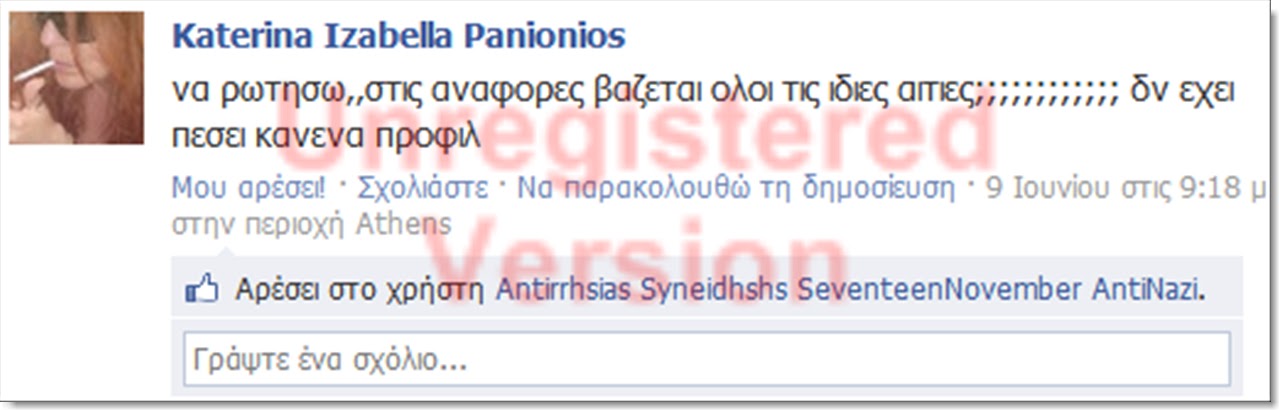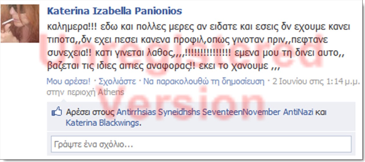 Σας ενημερώνουμε πως τον τελευταίο καιρό δεκάδες προφιλ Ελλήνων πατριωτών στο facebook δέχτηκαν φασιστική επίθεση από τον αναρχικό χώρο . Στόχος τους είναι η φίμωση των πατριωτών, αυτά είναι τα “δημοκρατικά” τους αισθήματα βλέπετε , έχουν πάθει λύσσα οι ακραίοι αυτοί ΑΝΘΕΛΛΗΝΕΣ ! Εμείς μετά από αυτές τις επιθέσεις που δεχτήκαμε από τον αναρχικό χώρο αρχίσαμε εντατική έρευνα για να εντοπίσουμε αυτά τα άτομα,.(τα βρήκαμε όπως θα δείτε παρακάτω) . Για να μπούμε λοιπόν στο ψητό … Ενημερώνουμε πως έχει γίνει ήδη καταγγελία στην δίωξη ηλεκτρονικού εγκλήματος , θα ακολουθήσουν μηνύσεις και αγωγές .Θα ενημερωθεί και το facebook.