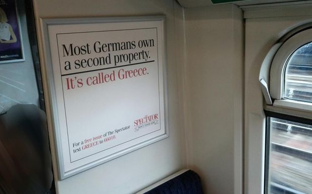 “Οι περισσότεροι Γερμανοί έχουν στην κατοχή τους και μια δεύτερη ιδιοκτησία. Το όνομα αυτής, Ελλάδα”, αναγράφεται σε αφίσες που έχουν κάνει την εμφάνισή τους στα τρένα της Αγγλίας.