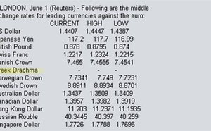 Βεβαίως, και ευτυχώς, δεν υπάρχουν ακόμη τιμές στην ισοτιμία της δραχμής έναντι του ευρώ, αλλά η αναφορά του νομίσματος έχει αναρτηθεί και βρίσκεται σε πλήρη ετοιμότητα δια παν ενδεχόμενο.