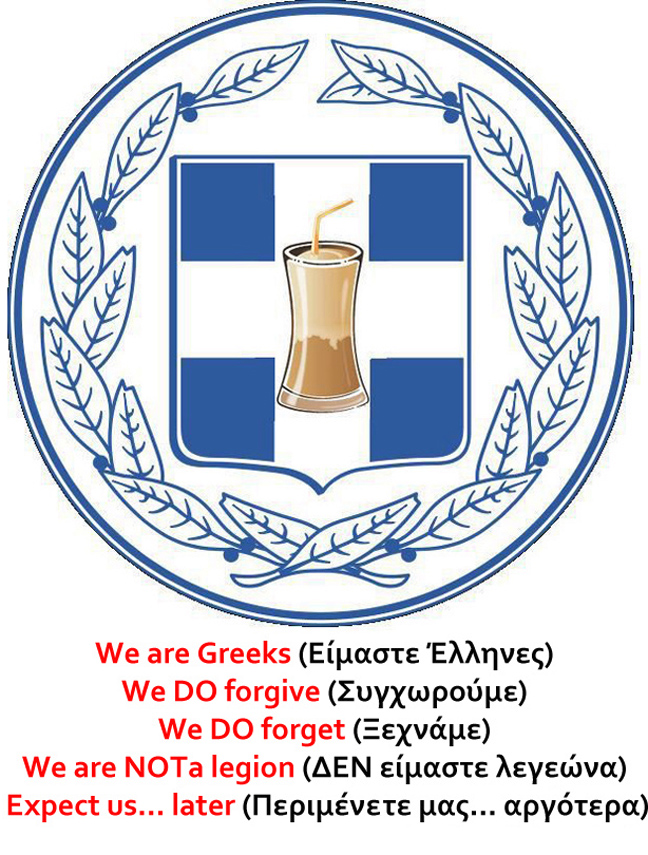 Είμαστε Έλληνες. Συγχωρούμε. Ξεχνάμε! Αυτά είναι τα χαρακτηριστικά μας γι’ αυτό στις εκλογές ψηφίσαμε ΠΑΛΙ αυτούς που θέλουν να τα ξεπουλήσουν όλα! Γιατί πάνω απ’ όλα, βάζουμε το φραπέ μας στη καφετερία! Ζήτω οι φραπεδοφόροι Έλληνες, που υπολογίζονται κάπου λιγότεροι από 36%!!
