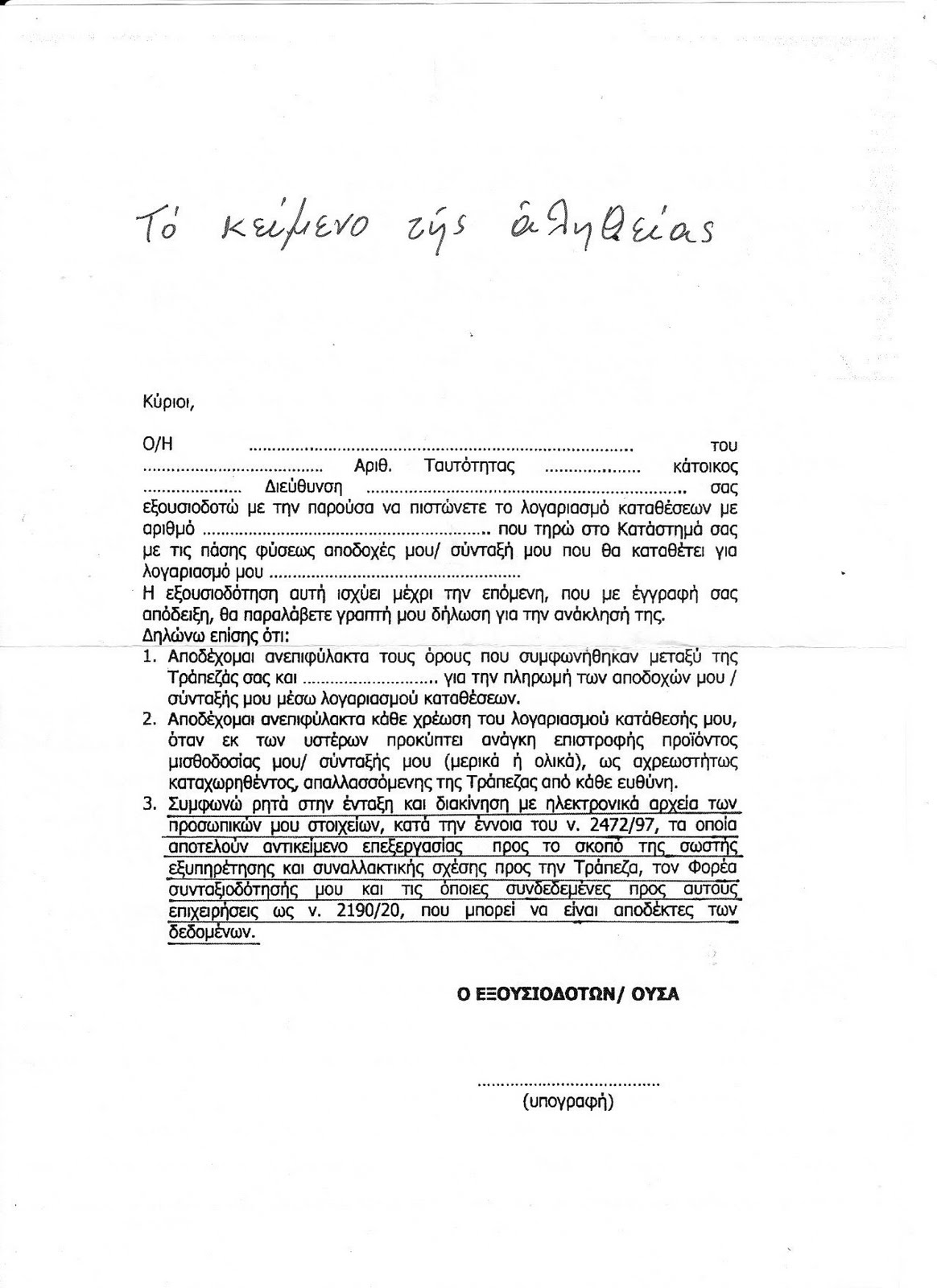 «Συμφωνώ ρητά στην ένταξη και διακίνηση με ηλεκτρονικά αρχεία των προσωπικών μου στοιχείων, κατά την έννοια του ν. 247297, τα οποία αποτελούν αντικείμενο επεξεργασίας προς το σκοπό της σωστής εξυπηρέτησης και συναλλακτικής σχέσης προς την Τράπεζα, τον Φορέα συνταξιοδότησης μου και τις οποίες συνδεδεμένες προς αυτούς επιχειρήσεις ως ν.219020, που μπορεί να είναι αποδέκτες των δεδομένων.»