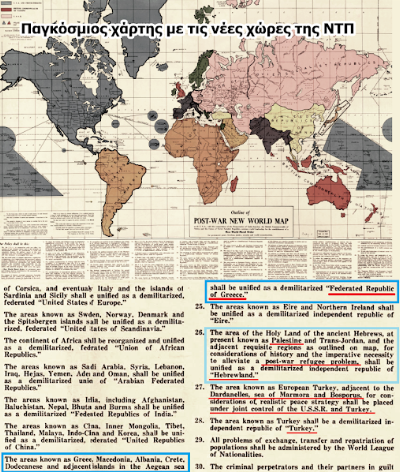 Ο χάρτης αυτός αναγράφει στα σχόλια – επεξηγήσεις, ότι εμείς οι ΗΠΑ θα δημιουργήσουμε μια Ηθική Νέα Τάξη Πραγμάτων και για την ασφάλειά μας θα καταλάβει τις γύρω χώρες. Ήδη ο Τραμπ δηλώνει ότι η κατάληψη των γύρω των ΗΠΑ χωρών είναι ζήτημα εθνικής ασφαλείας. Ο Τραμπ δηλώνει σήμερα κάτι που είχε αποφασισθεί πριν από έναν αιώνα περίπου. Οι ανυπάκουες χώρες θα τιμωρούνται με μποϋκοτάζ, καραντίνες, κλπ, και από την -προσέξτε τον όρο-, Διεθνή Αστυνομία. Θέλουν να δημιουργήσουν Διεθνή Αστυνομία! Όλες οι νέες χώρες θα αποστρατιωτικοποιηθούν και θα αναδιοργανωθούν. Μήπως ο πόλεμος στην Ουκρανία είναι πόλεμος καταστροφής οπλισμού; Η Δύση στέλνει όπλα, οι Ρώσοι τα καταστρέφουν και άντε πάλι ξανά.