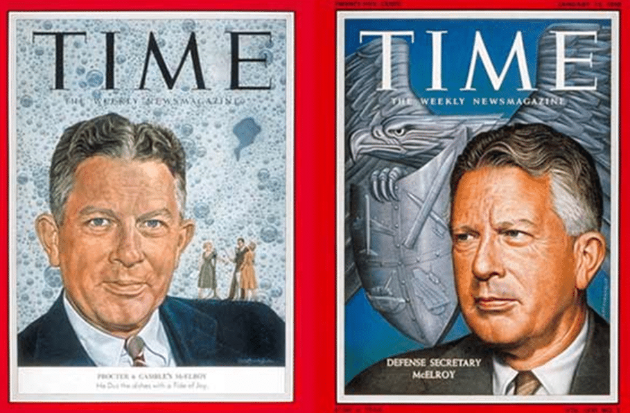 Ακολουθούν δύο εξώφυλλα του περιοδικού Time: Το ένα είναι του Neil McElroy της Proctor & Gamble και το άλλο του Neil McElroy, του Υπουργού Άμυνας.
