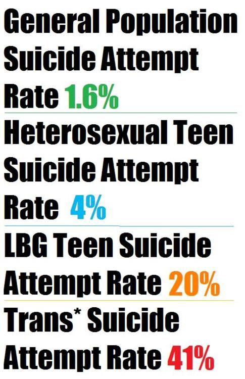 Μελέτες σε την ΗΠΑ για τις αυτοκτονίες αναφέρουν ότι τουλάχιστον το 41% των τρανσεξουαλικών ατόμων στη χώρα έχουν αποπειραθεί να αυτοκτονήσουν μία φορά. Ακόμη και αν η οικογένεια τους δέχεται και οι φίλοι και το περιβάλλον, οι πιθανότητές να κάνουν μια απόπειρα αυτοκτονίας είναι υψηλότερη από τις άλλες ομάδες.