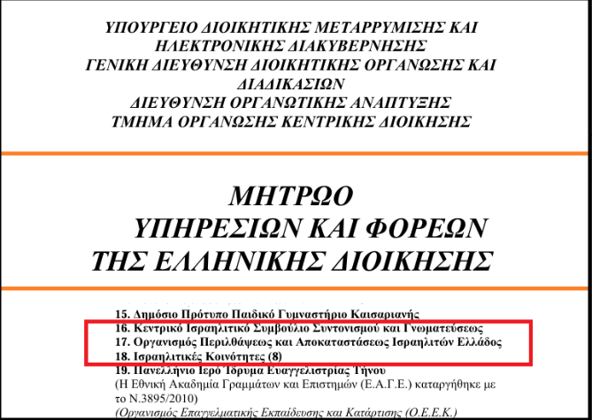 Προσέξτε τώρα την προέκταση. Σύμφωνα με το εν λόγω Μητρώο του αρμοδίου Υπουργείου, ΝΠΔΔ, δηλαδή Δημόσιες Υπηρεσίες, είναι και οι παρακάτω, με αρίθμηση από το πρωτότυπο κείμενο: «16. Κεντρικό Ισραηλιτικό Συμβούλιο Συντονισμού και Γνωματεύσεως 17. Οργανισμός Περιλθάψεως και Αποκαταστάσεως Ισραηλιτών Ελλάδος 18. Ισραηλιτικές Κοινότητες.» (Αυτά συμπεριλαμβάνονται στο ανωτέρω Μητρώο, Τμήμα Α. Τομέας Παιδείας και δια βίου μάθησης και θρησκευμάτων, ΙΙΙ. Νομικά Πρόσωπα Δημοσίου Δικαίου. Επίσης στα ελληνικά του Υπουργείου υπάρχει και η νέα λέξις «περίλθαψη»